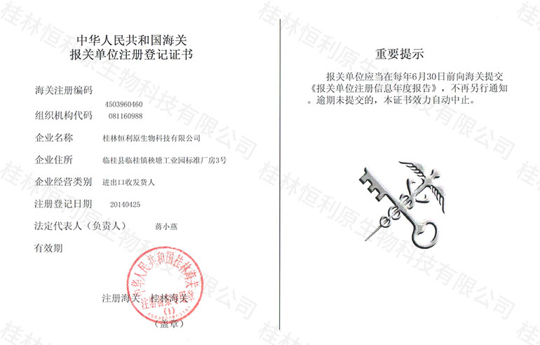 桂林恒利原生物科技有限公司海关报关单位注册登记证书